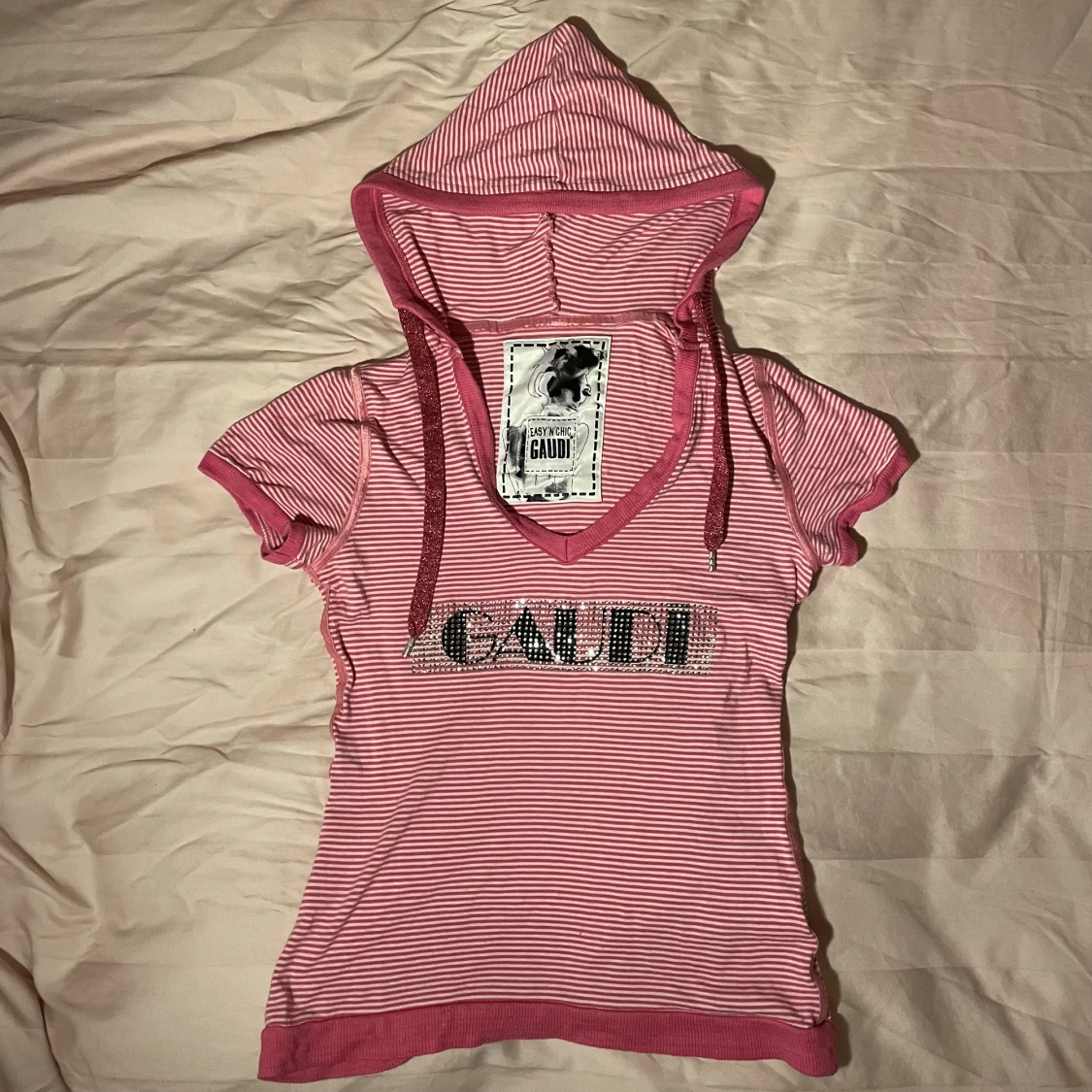 Så snygg rosa och vit randig tshirt med huva. Står gaudi med svart text och rhinestones över. Fint skick, alla stenar är kvar. Står ej storlek men passar mig med s-m. Kan mötas upp nära Mariatorget eller posta.