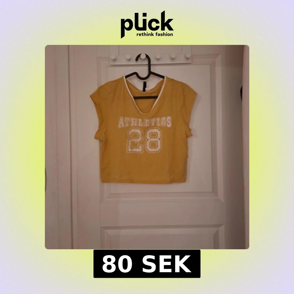 Säljer en gul croppad topp från H&M med texten 'ATHLETICS 28' i vitt framtill. Toppen har korta ärmar och en vit kant vid halsringningen. Perfekt för en avslappnad stil.