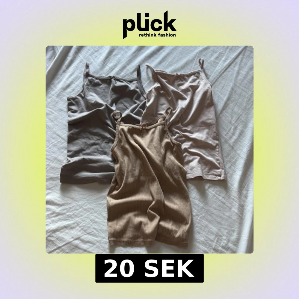 Tre stilrena linnen i grått, beige och ljusrosa. Alla har smala axelband och en enkel, rak passform. Ett av linnena är ribbat för extra textur och de andra två är släta. Perfekta att matcha med jeans eller shorts för en clean look.