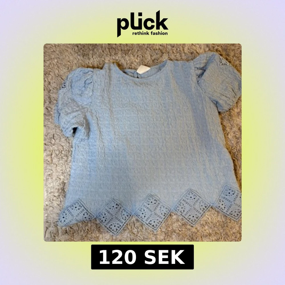 Supersöt ljusblå blus med puffärmar och dekorativa spetsdetaljer längs nederkanten. Blusen har rund halsringning och ett unikt mönster i tyget som ger en extra touch. Perfekt för dig som gillar romantisk stil.