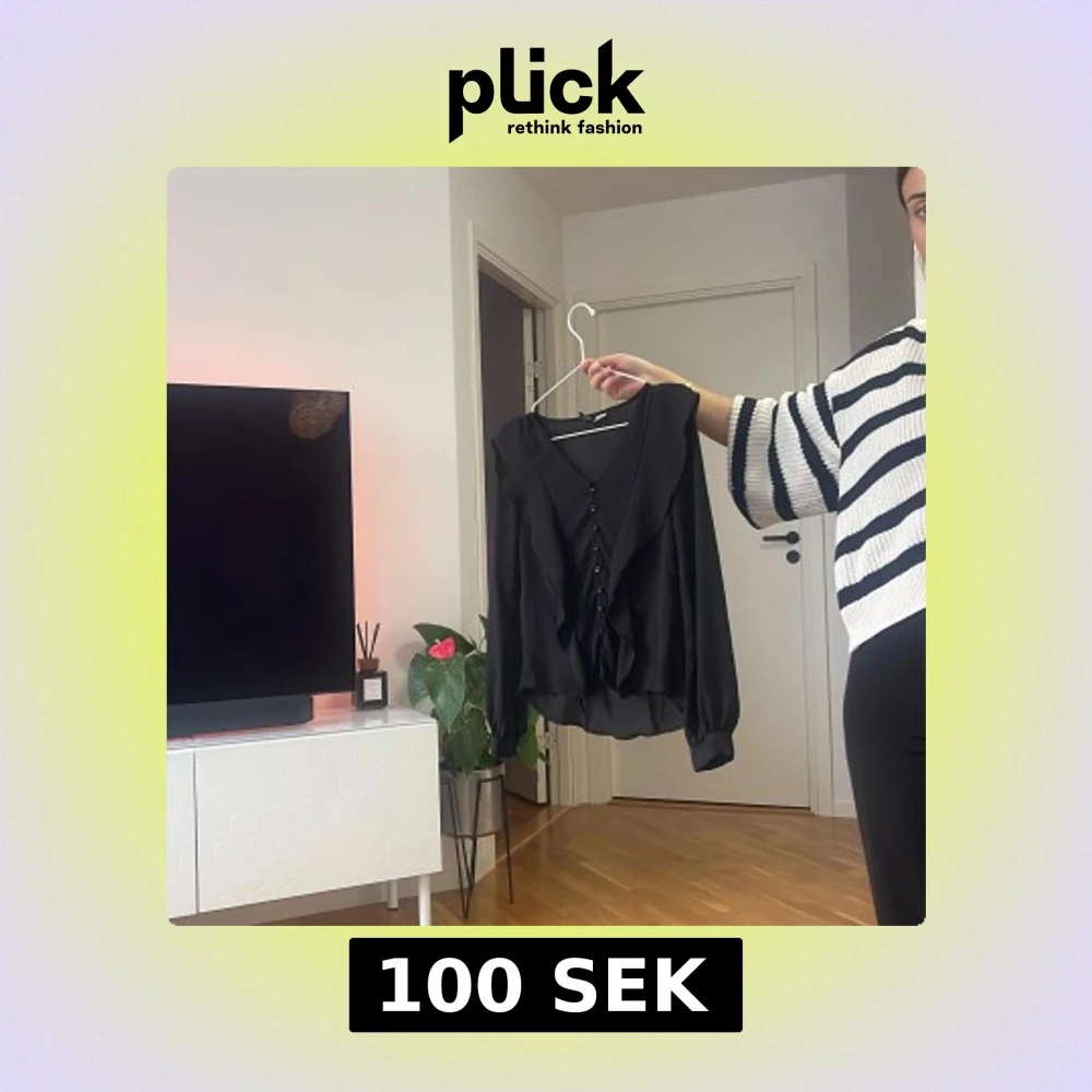Säljer en svart blus med v-ringning, volangdetaljer framtill och knappar längs hela framsidan. Blusen har långa ärmar med breda muddar och är tillverkad i ett lätt, flowy material som ger en snygg siluett.