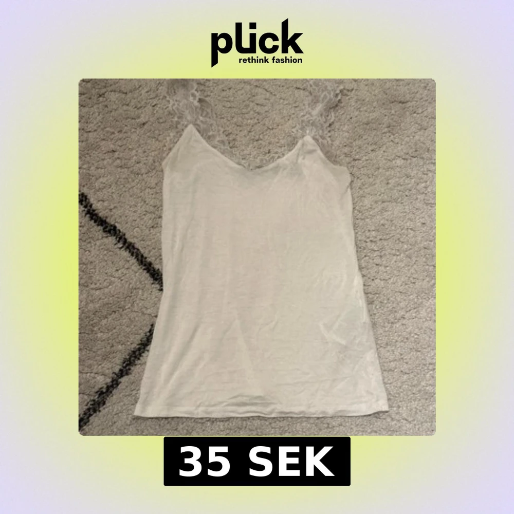 Säljer en vit linnetopp med v-ringad hals och breda axelband i spets. Toppen är ärmlös och har en enkel, stilren design som passar perfekt till sommaren. Materialet känns lätt och luftigt, och spetsdetaljen ger en extra touch.