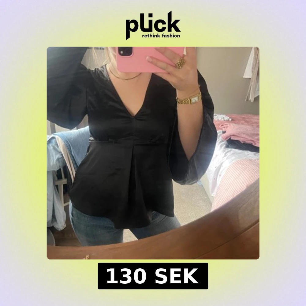 Säljer en svart blus med snygg v-ringning och riktigt vida ärmar som ger en cool siluett. Blusen har en lätt glansig finish och ett veck framtill som ger extra form. Perfekt att styla med jeans eller kjol för en trendig look.
