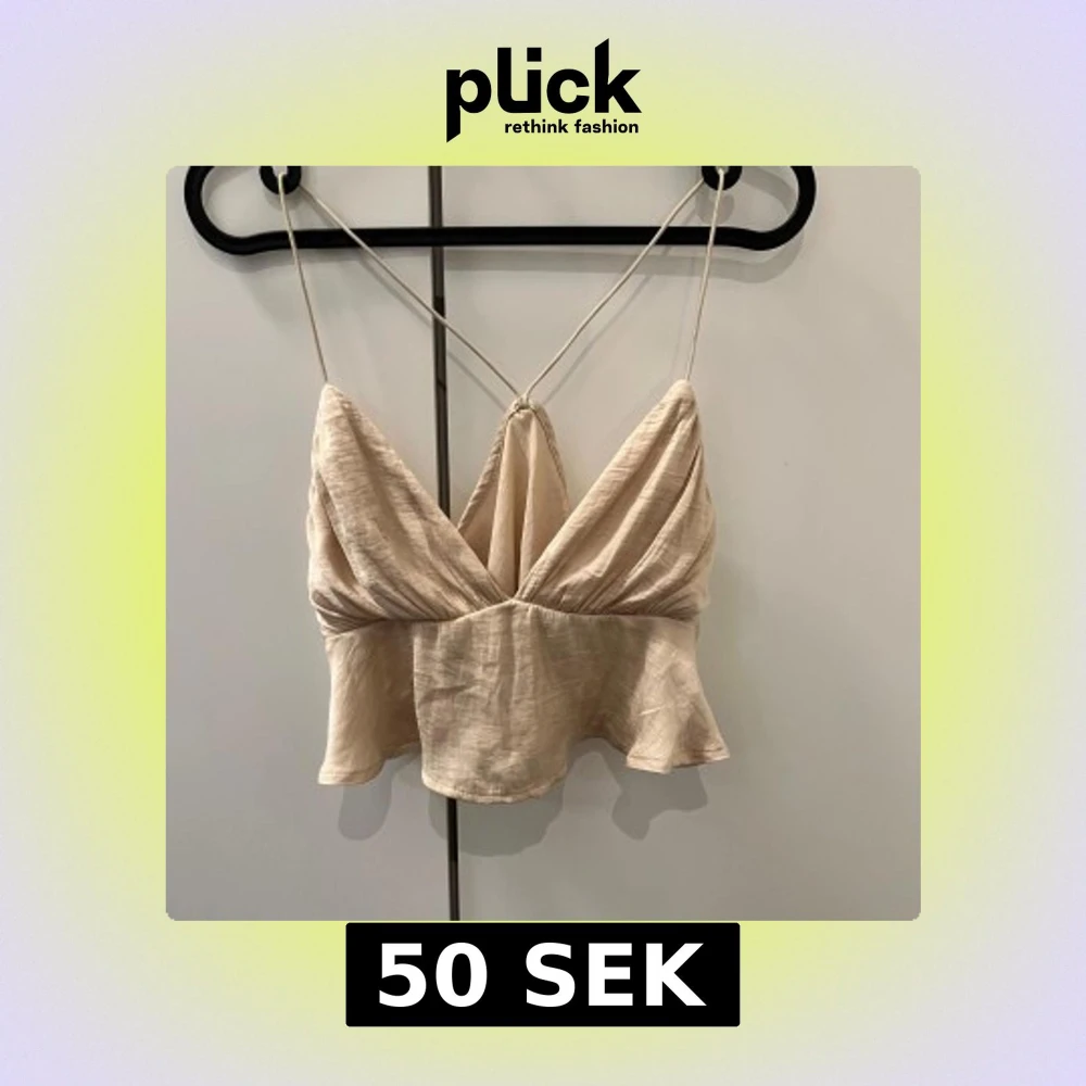 Snyggt beige linne med tunna axelband och djup v-ringning. Toppen har en luftig passform och korsade band i ryggen, vilket ger en stilren look. Perfekt för varma sommardagar.