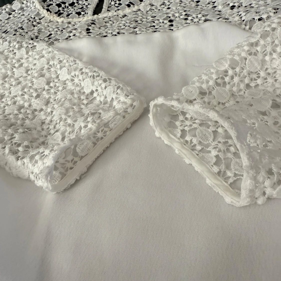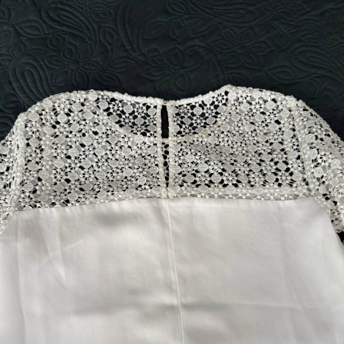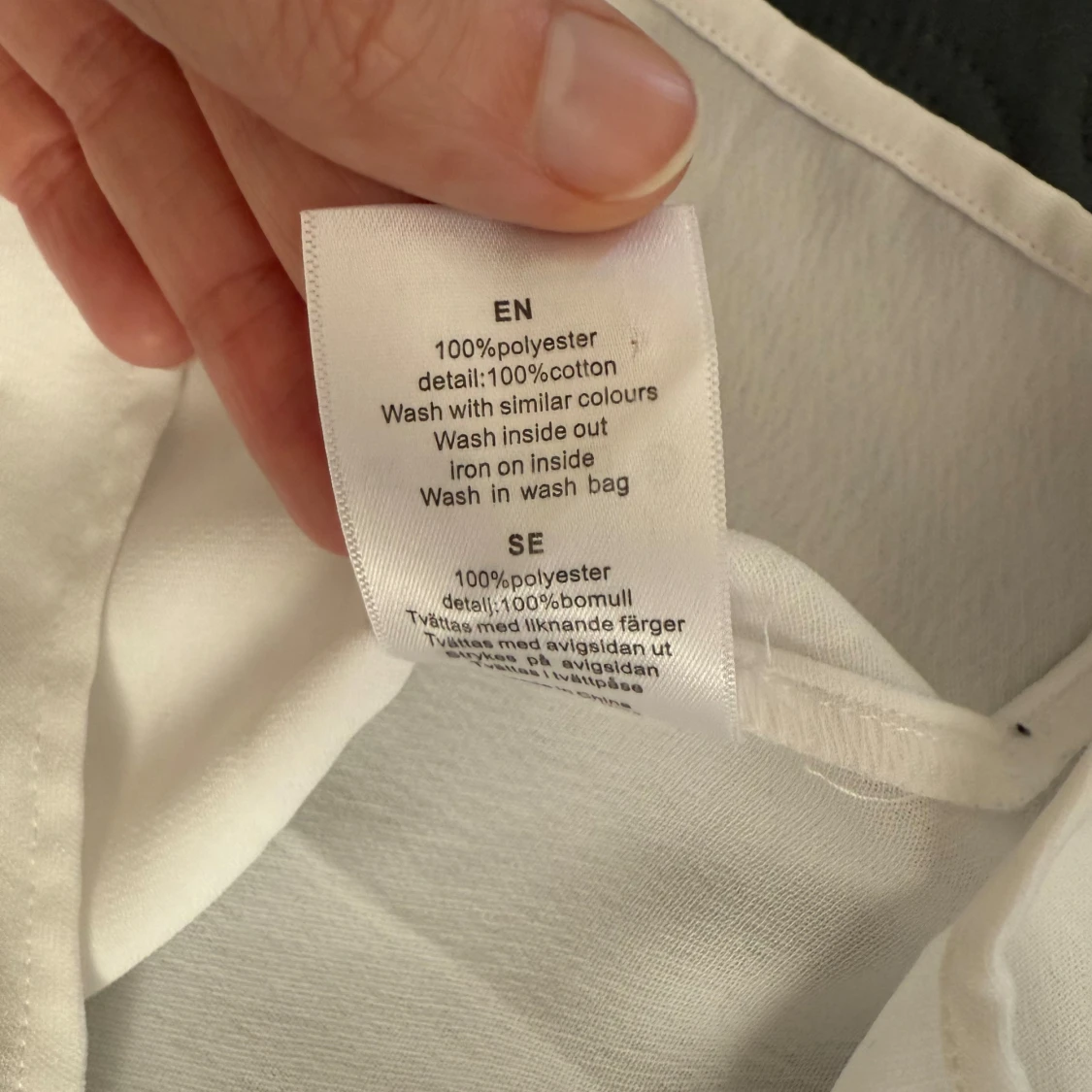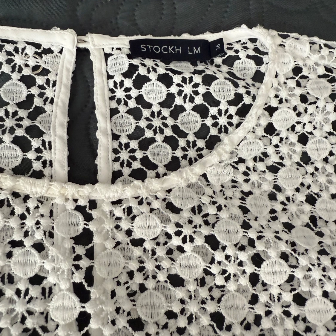 Säljer en elegant vit blus från Stockh LM med vackra spetsdetaljer på ärmarna och övre delen. Blusen har trekvartsärmar och en rund halsringning. Tillverkad i polyester med bomullsdetaljer. Perfekt för en stilren look. Storlek 36 men enligt mig passar bättre 34(xs)