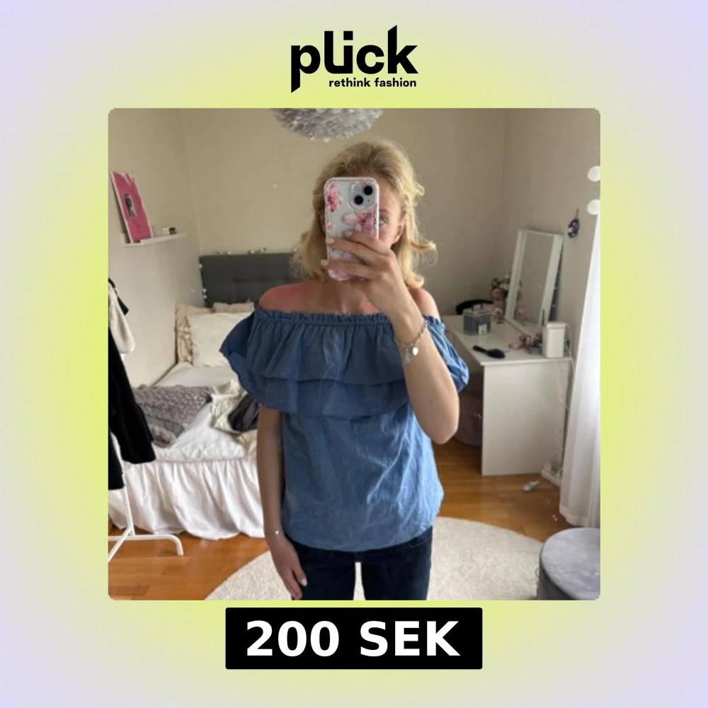 Supersöt blå offshoulder-blus från Neo Noir med bred volang runt hela axelpartiet. Luftig och lätt i bomull, perfekt för varma dagar. Snygg att styla med jeans eller kjol!! Aldrig använd med prislapp kvar!!🥰😍