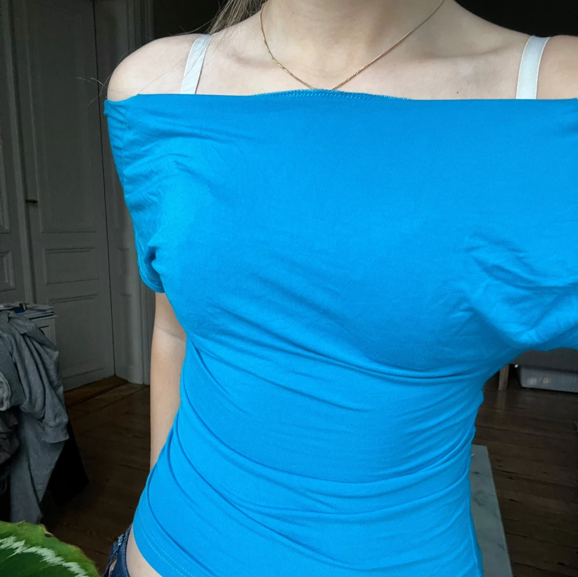 Säljer en snygg blå offshoulder topp i tight passform. Toppen är ärmlös och har en öppen rygg, perfekt för sommardagar eller festliga tillfällen. Materialet är mjukt och stretchigt, vilket gör den bekväm att bära hela dagen!💙