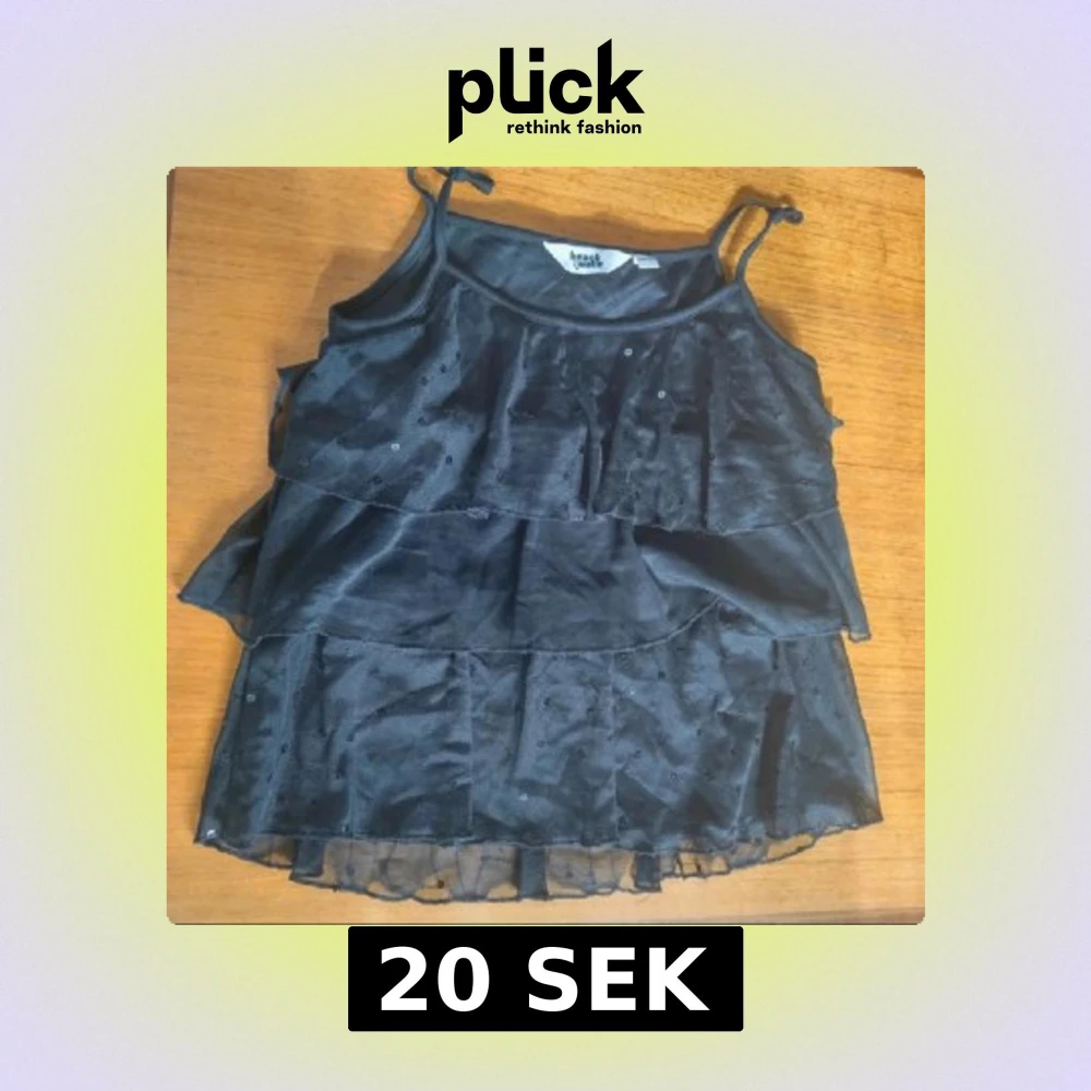 Supersöt svart linnetopp med tunna axelband och flera lager volanger. Toppen har små paljetter, bra skick