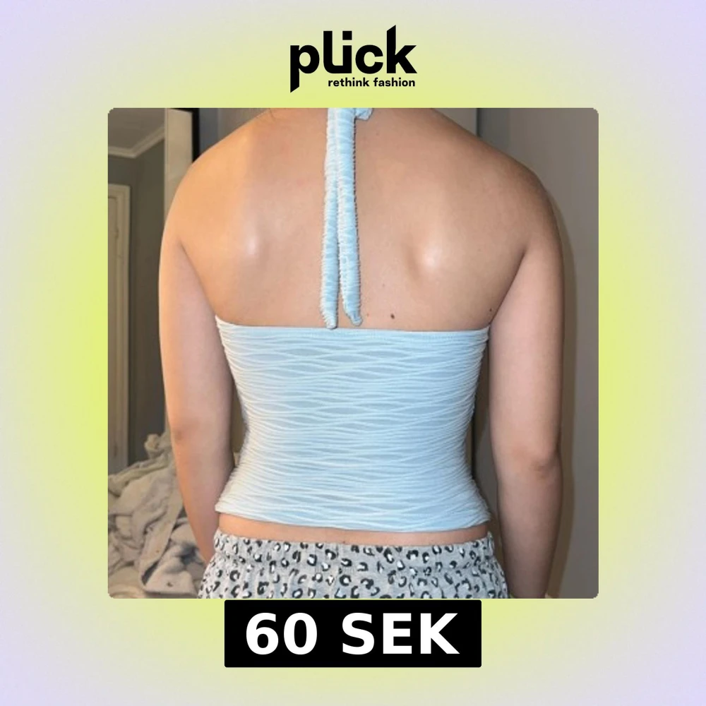 Supersnygg ljusblå halterneck topp med strukturmönster och en guldig blomma framtill. Toppen har croppad passform och knyts i nacken. Perfekt för dig som vill sticka ut med en unik detalj och fräsch färg.