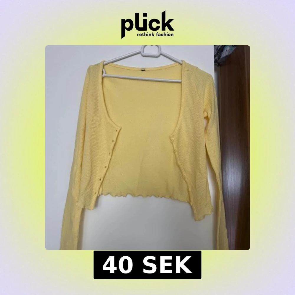 Söt ljusgul bolerotopp med lång ärm och croppad passform. Toppen har små knappar framtill och vågig kant nertill för en extra detalj. Perfekt att slänga över ett linne eller klänning för en fräsch look.