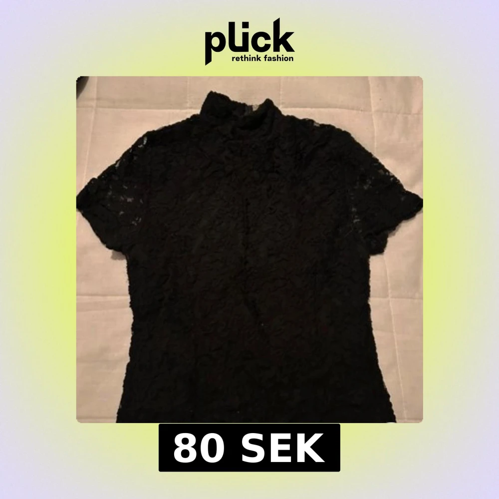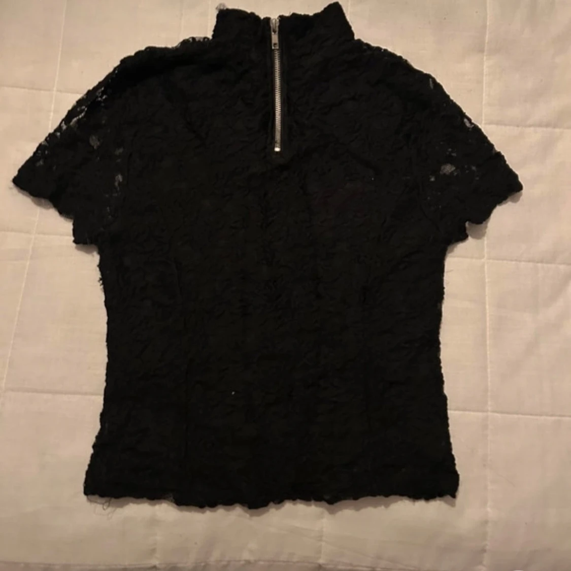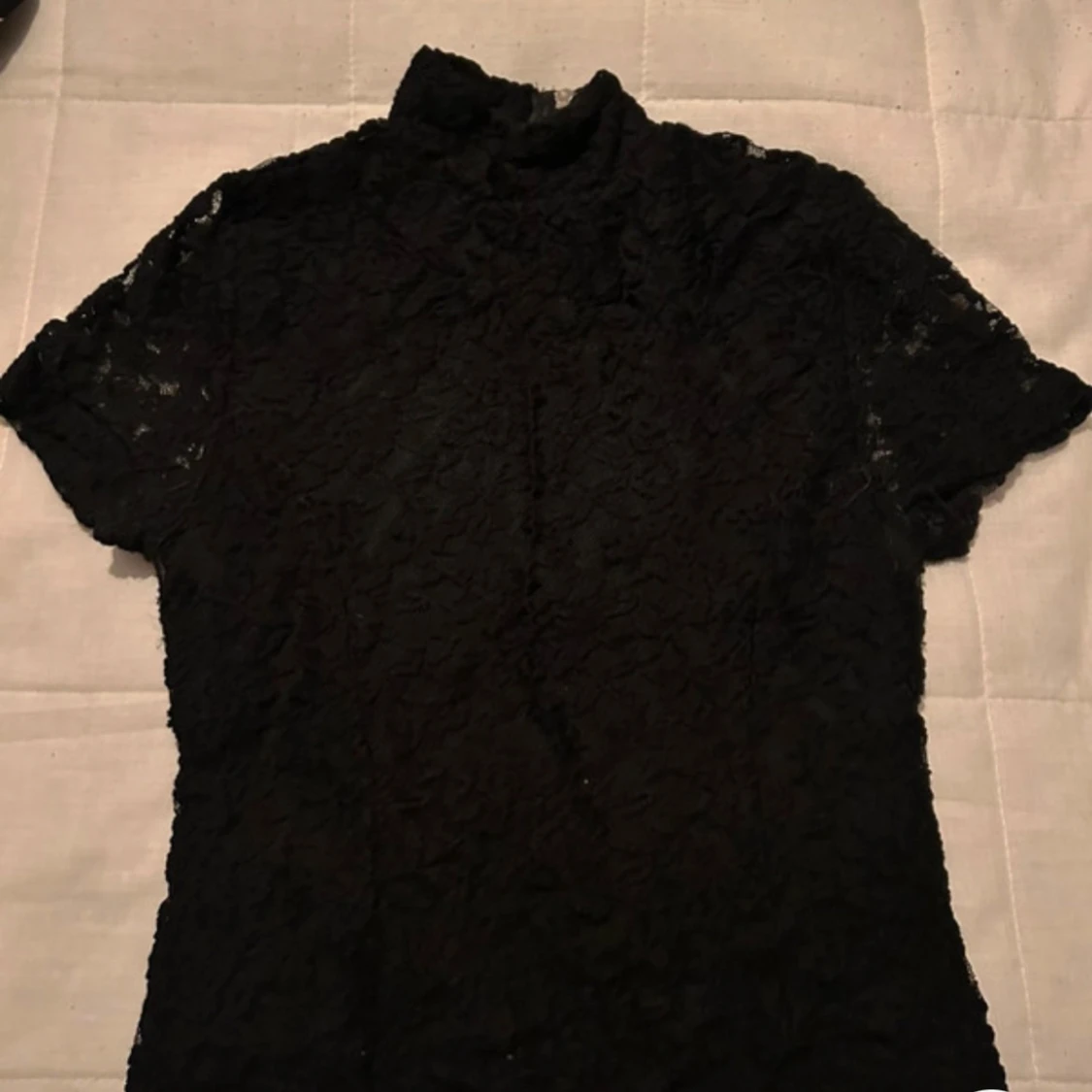 Elegant svart spetsblus med korta ärmar och hög krage. Blusen har en dragkedja i ryggen för en stilren look. Perfekt för en chic och sofistikerad stil. (Lånade bilder)
