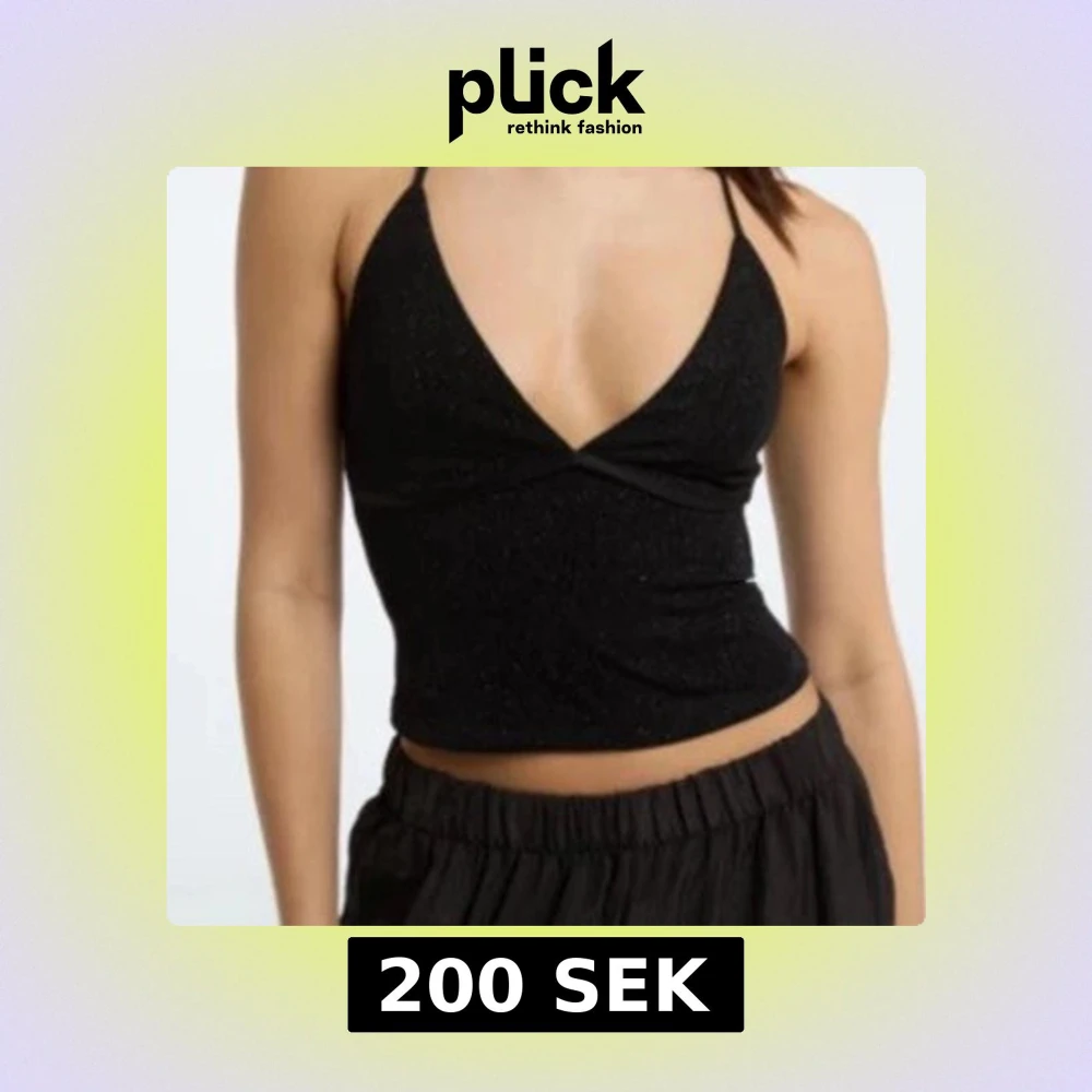 Snygg svart croppad linnetopp med tunna axelband och glittrigt material. Djup v-ringning framtill ger en trendig look, perfekt för att sticka ut. Toppen har en figurnära passform och är superenkel att matcha med både kjol och byxor.