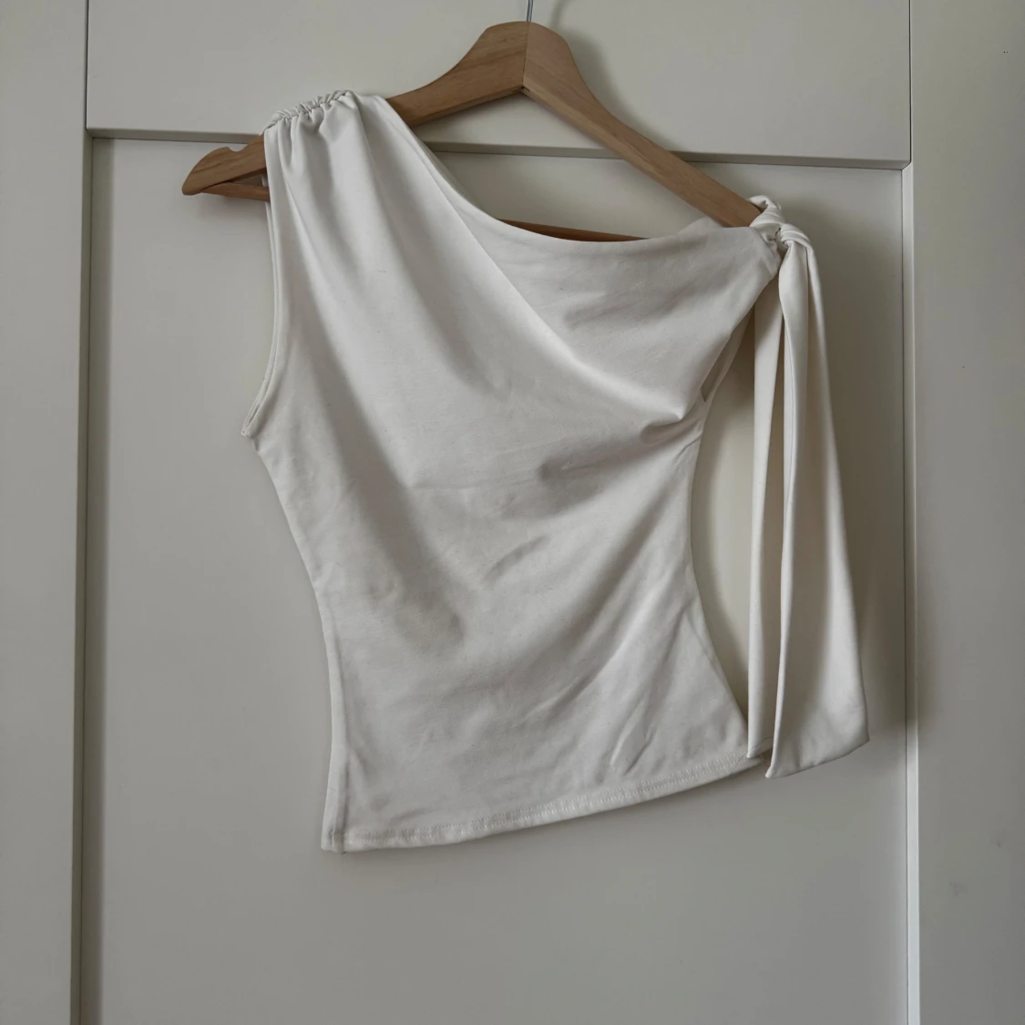 Snygg vit oneshoulder topp med knyt på ena axeln. Topp i mjukt material med figurnära passform, perfekt för att lyfta din outfit med en trendig touch.