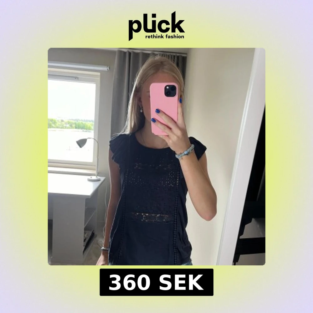 Säljer en mörkblå blus med fina spetsdetaljer och volang vid axlarna. Blusen är ärmlös och har en rund halsringning.