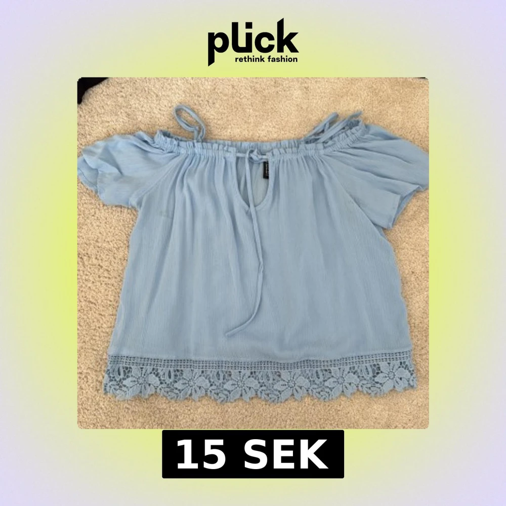 Supersöt ljusblå blus från H&M Divided med offshoulder och korta ärmar. Blusen har knytning vid halsen och en bred spetskant nertill med blommigt mönster. Luftigt material som passar perfekt till varma dagar.
