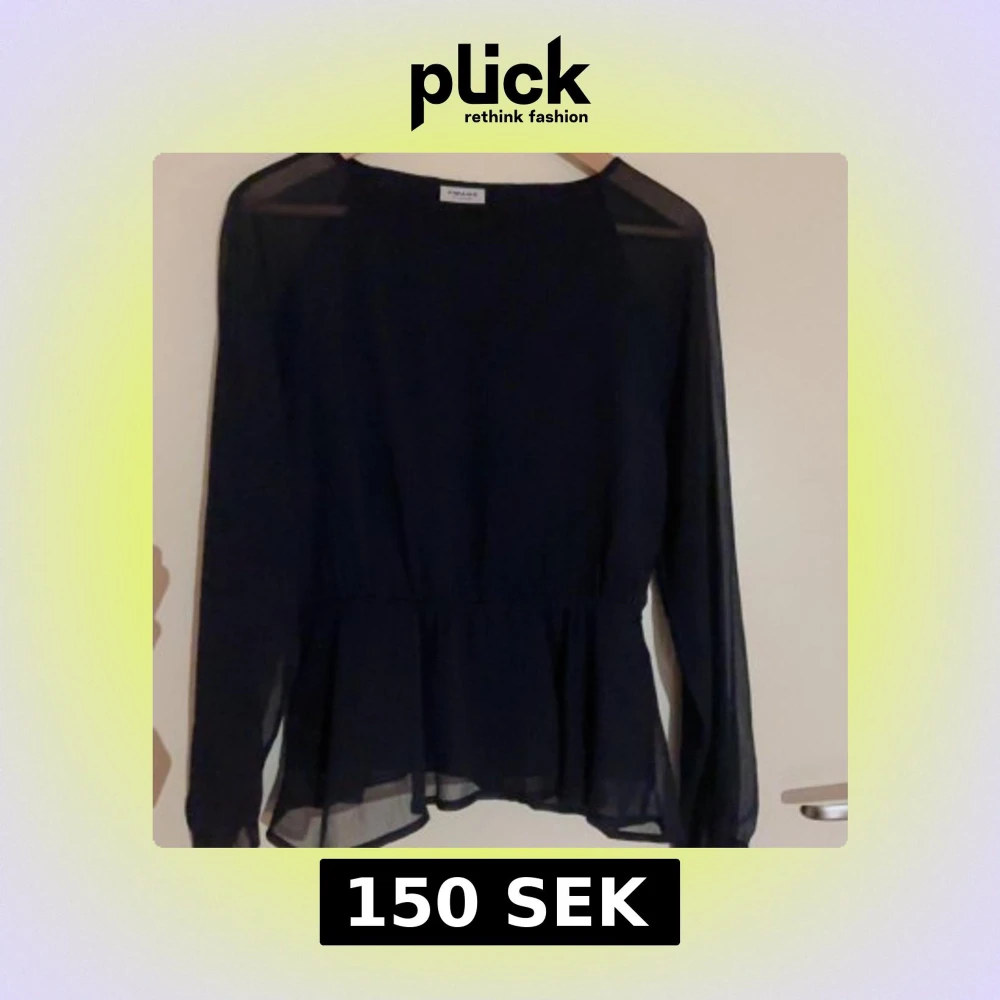 Säljer en svart blus från Aware med transparenta långa ärmar och lätt volang nertill. Blusen har en lös passform och är tillverkad i ett tunt, flowy material som ger en snygg siluett. Perfekt att styla med jeans eller kjol.