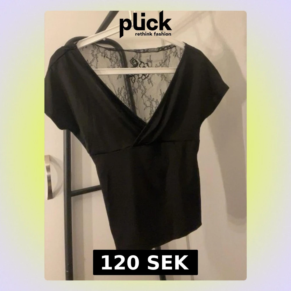 Snygg svart omlottopp med djup v-ringning och transparent spets i ryggen. Toppen har korta ärmar och en knytning framtill som ger en extra touch. Perfekt för dig som gillar stilrena plagg med lite edge.