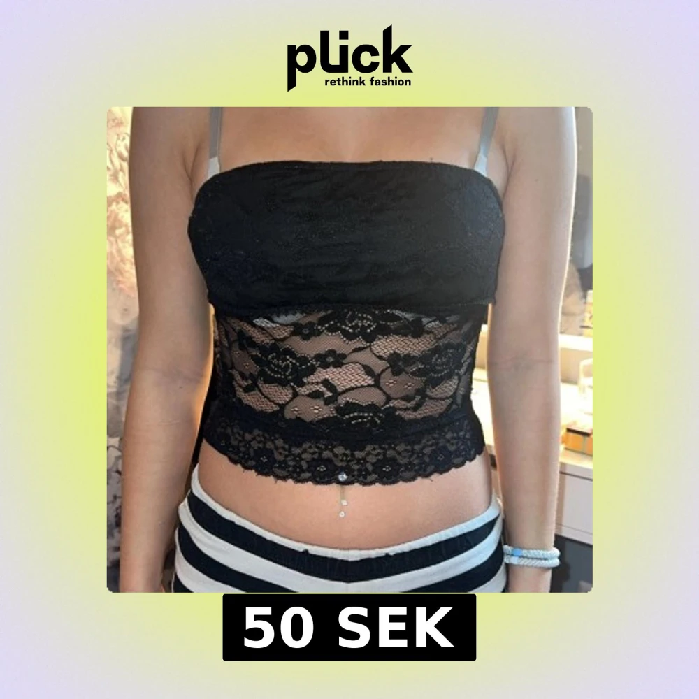 Säljer en svart bandeau tubtopp i spets med blommigt mönster. Toppen är croppad och har en transparent sektion i midjan som ger en snygg look. Perfekt för dig som vill sticka ut med en trendig och feminin stil.