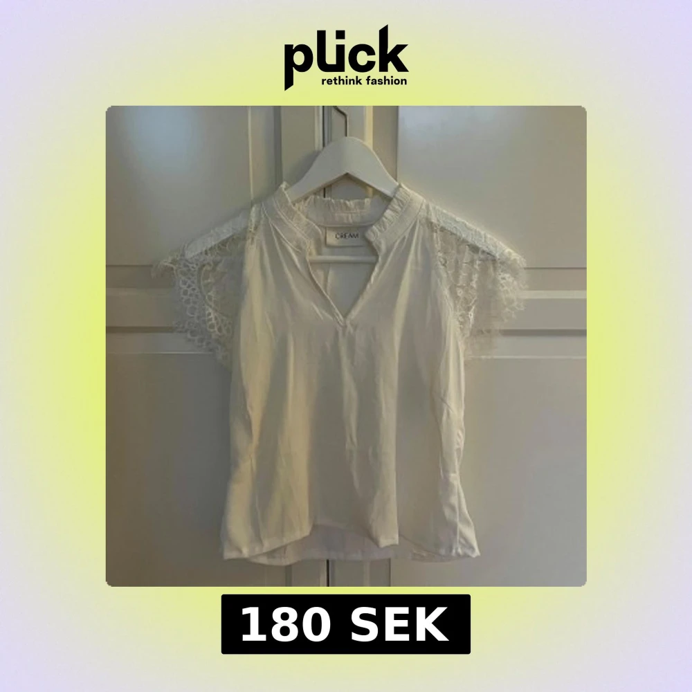 Säljer en vit blus från Cream med v-ringning och vackra spetsdetaljer på ärmarna. Blusen har korta, luftiga ärmar i spets och en mjuk, feminin design. Perfekt för en fräsch och stilren look.