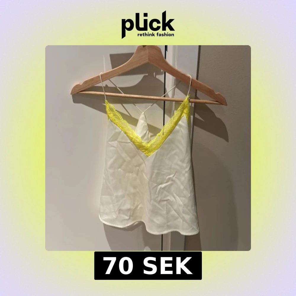Snygg vit linnetopp med tunna axelband och v-ringning dekorerad med gul spets. Toppen har en lös passform och är tillverkad i ett glansigt material som ger en lyxig känsla. Perfekt för sommarens varma dagar och för dig som gillar färgklickar.
