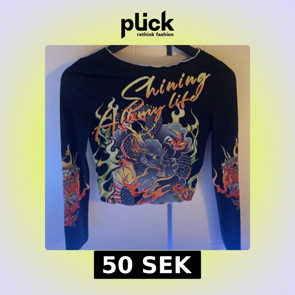 Cool svart långärmad topp med färgstarkt drakmotiv, eldflammor och texten 'Shining All my life' i neonfärger. Toppen är croppad och har tajt passform, perfekt för dig som vill sticka ut med edgy streetstyle.