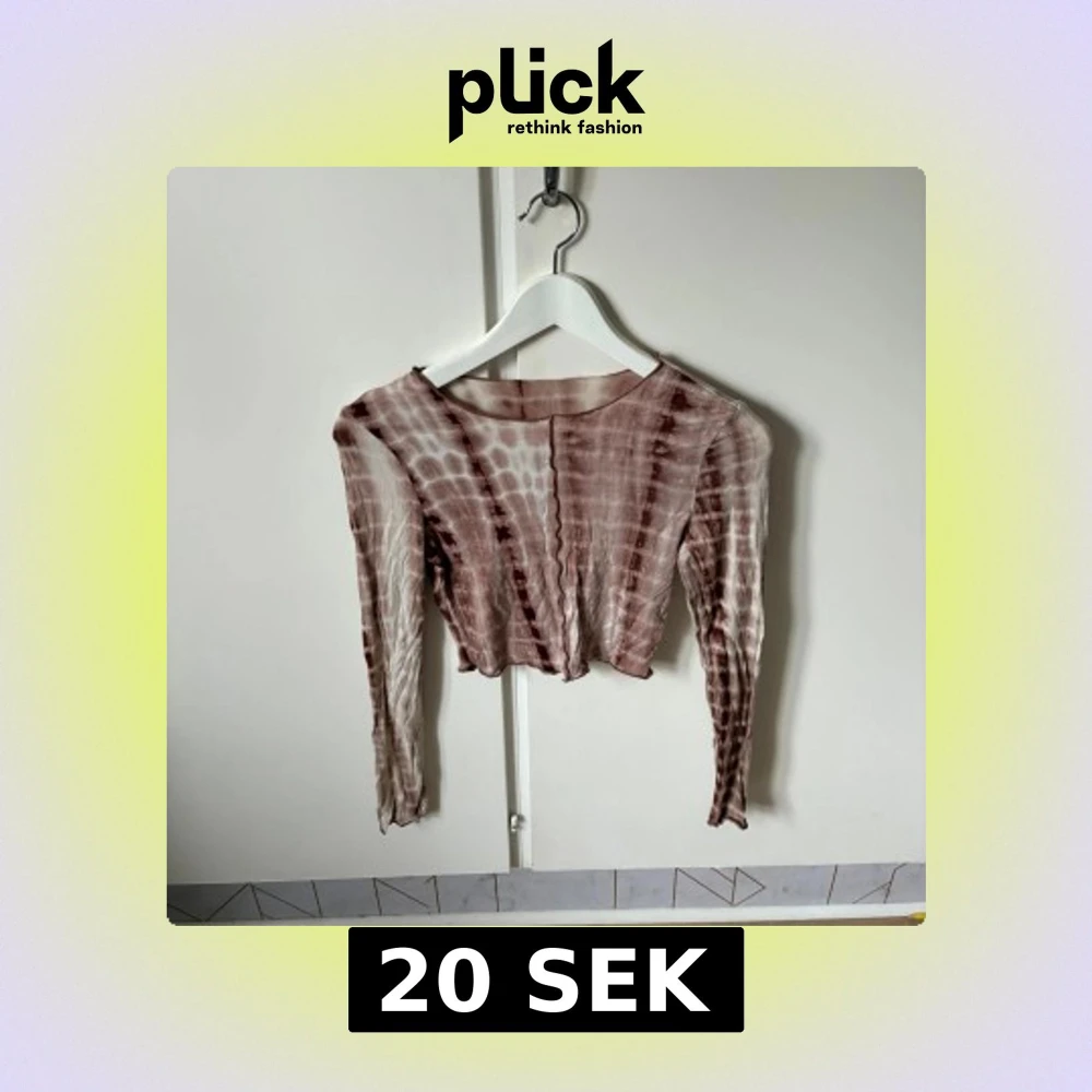 Säljer en croppad långärmad topp från SHEIN i storlek 34. Toppen har ett coolt batikmönster i bruna och beige toner, med vågig kant nedtill och tunn, mjuk polyesterkvalitet. Perfekt för dig som gillar trendiga och unika plagg med lite edge.