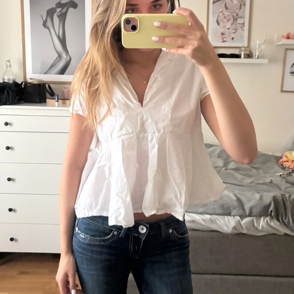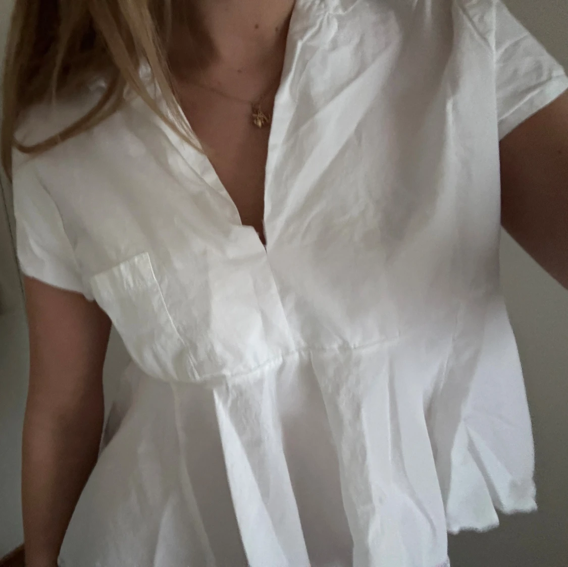 Säljer en söt vit blus med v-ringning och korta ärmar. Modellen är luftig och har en lätt utställd, flowy passform som ger en avslappnad vibe. Perfekt till jeans eller kjol för en fräsch look. Gjord i bomull för en skön känsla.