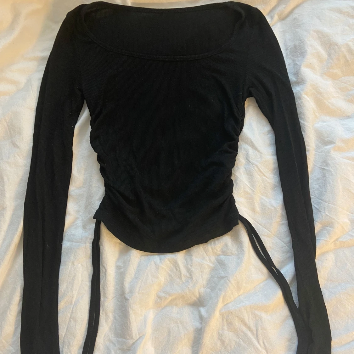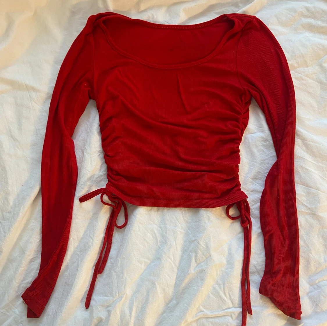 Två långärmade croppade toppar i ribbad bomull, en röd och en svart. Båda har snörning i sidorna som man kan knyta till rosetter. 60kr st men båda för 150k