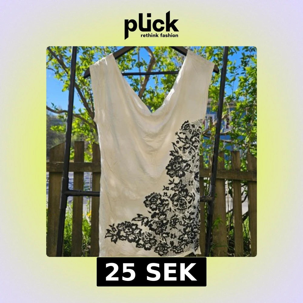 Säljer en vit topp med snygg svart blommig detalj längs ena sidan. Toppen har en djup v-ringning och är ärmlös, perfekt för varma dagar. Materialet känns lätt och svalt.