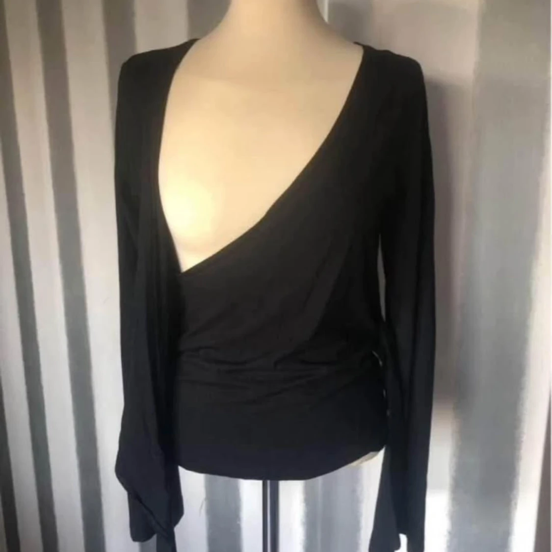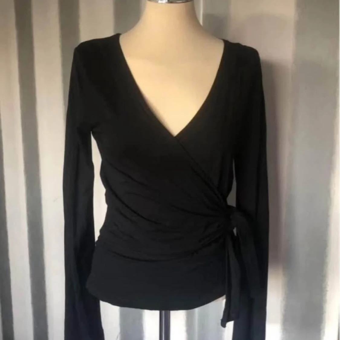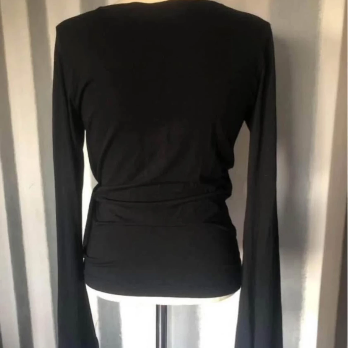 Svart omlottopp med lång ärm och djup v-ringning. Toppen har knytband i sidan som ger en snygg passform och trendig look. Perfekt att styla med jeans eller kjol för en cool outfit. Storlek 36/38 , viscose mjuk bomulls känsla . Nyskick