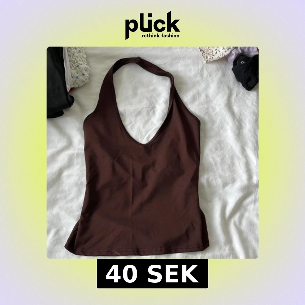 Säljer ett brunt halterneck linne med djup v-ringning och smickrande passform. Toppen är ärmlös och har en enkel, stilren design som passar perfekt till jeans eller kjol. Materialet känns mjukt och stretchigt, vilket gör den bekväm att bära hela dagen.