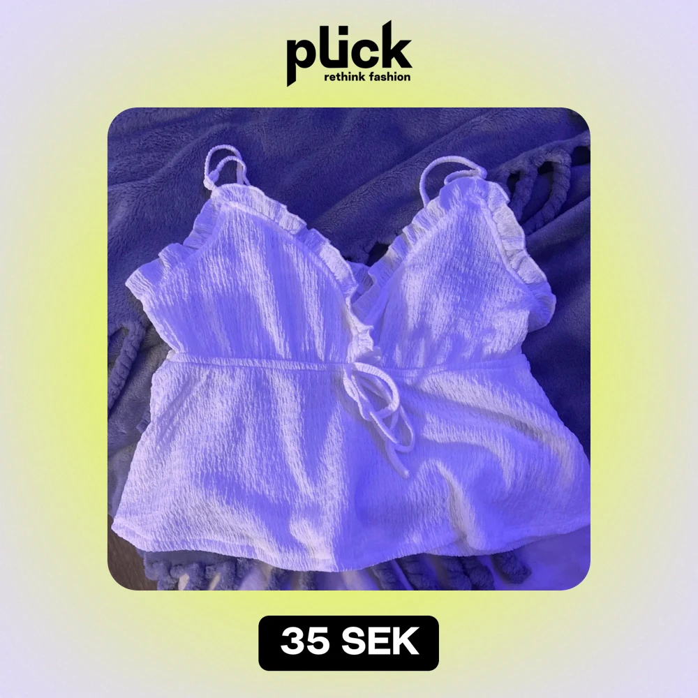 Säljer en söt vit ribbad topp med volangdetaljer och knytning framtill. Toppen har smala axelband och en feminin design som passar perfekt för sommardagar.