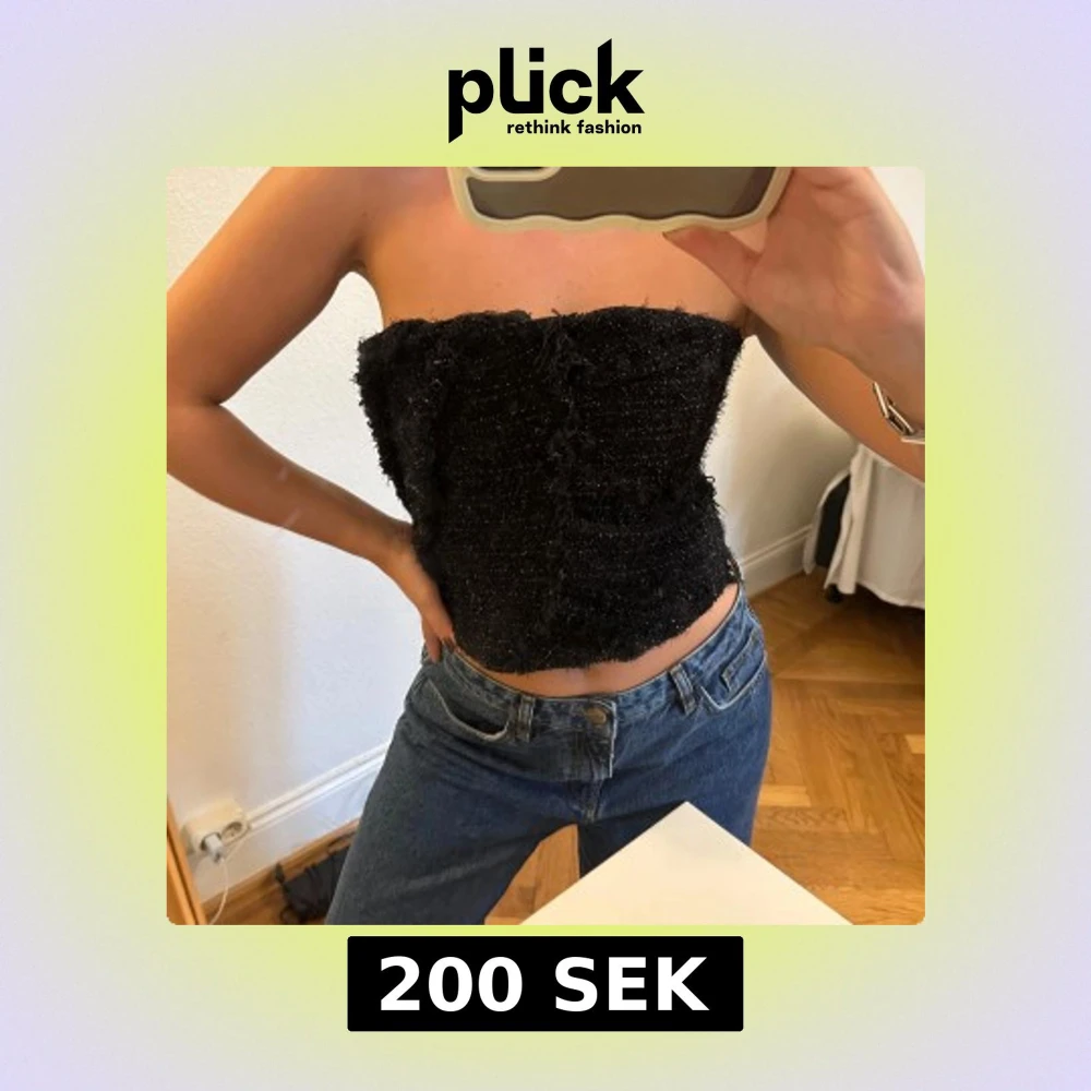 Säljer en svart glittrig tubtopp i bouclé-liknande material. Toppen är axelbandslös och har en rå, fransig kant upptill och nertill för en edgy look. Perfekt att styla med jeans eller kjol för en cool vibe.