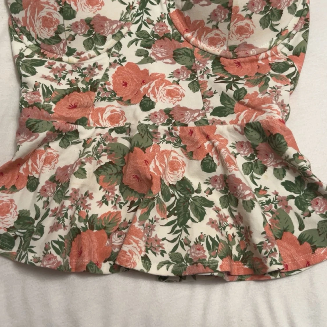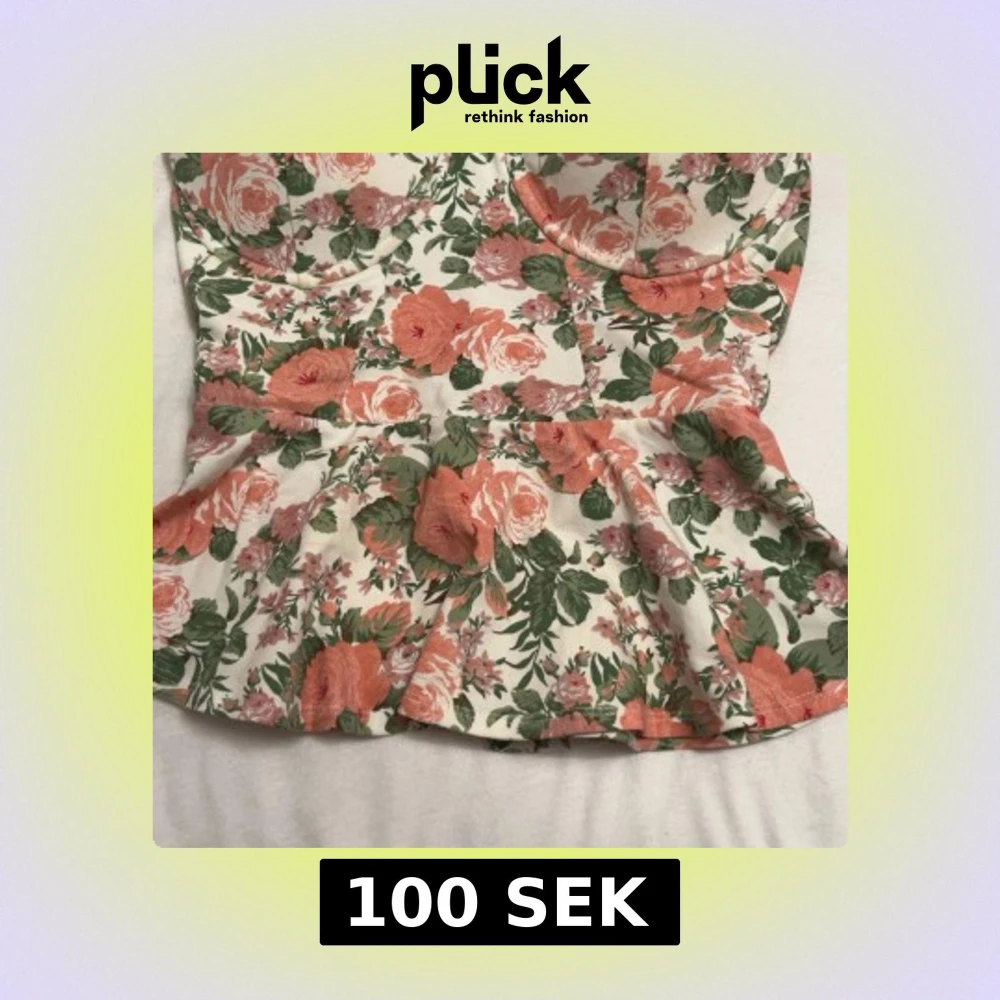Superfin topp med peplumvolang och blommigt mönster i rosa, grönt och vitt. Toppen har markerade kupor och figurnära passform som ger en snygg siluett. Perfekt för dig som vill sticka ut med en romantisk vibe.