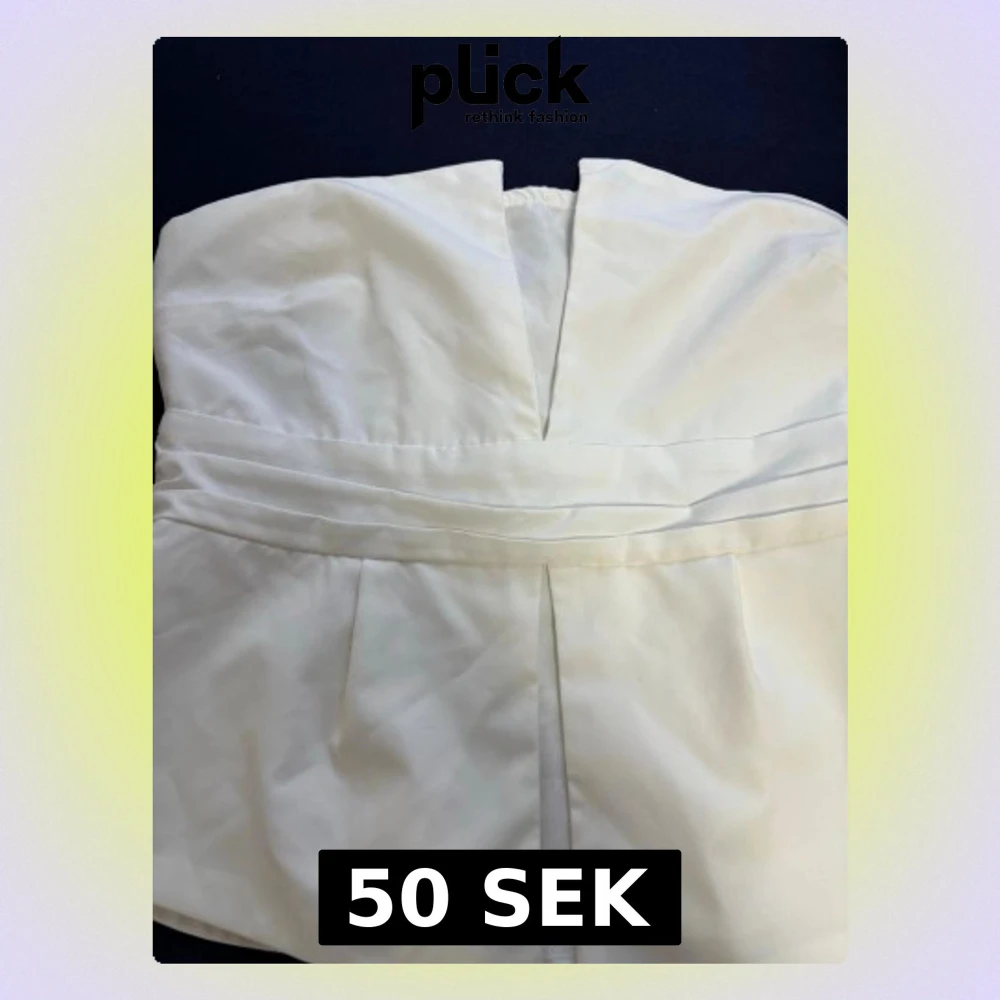 Snygg vit axelbandslös tubtopp med markerad midja och djup v-ringning framtill. Toppen har veckade detaljer och dragkedja i ryggen för enkel påklädning. Perfekt för att skapa en clean och stilren look.