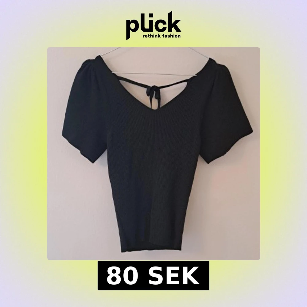 Svart ribbad topp med korta puffärmar och v-ringning. Toppen har en snygg knytning i ryggen och är figurnära i modellen. Perfekt för dig som gillar stilrena och trendiga plagg med det lilla extra.