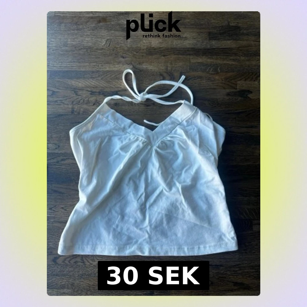 Säljer en vit topp med v-ringning och knytband i nacken. Tillverkad i mjukt bomullsmaterial för en skön känsla.