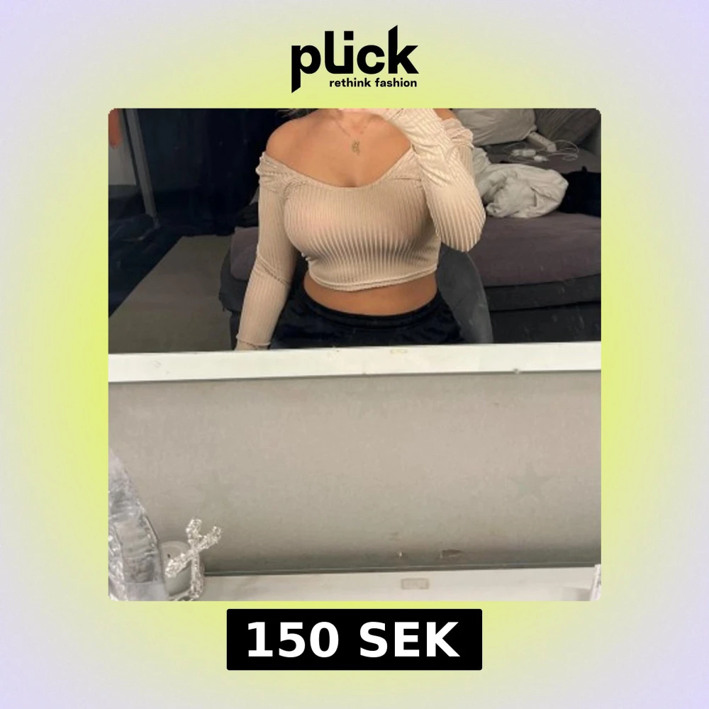 Säljer en beige offshoulder topp med långa ärmar och ribbad struktur. Toppen är croppad och har en snygg, figurnära passform som passar perfekt till både jeans och kjol.