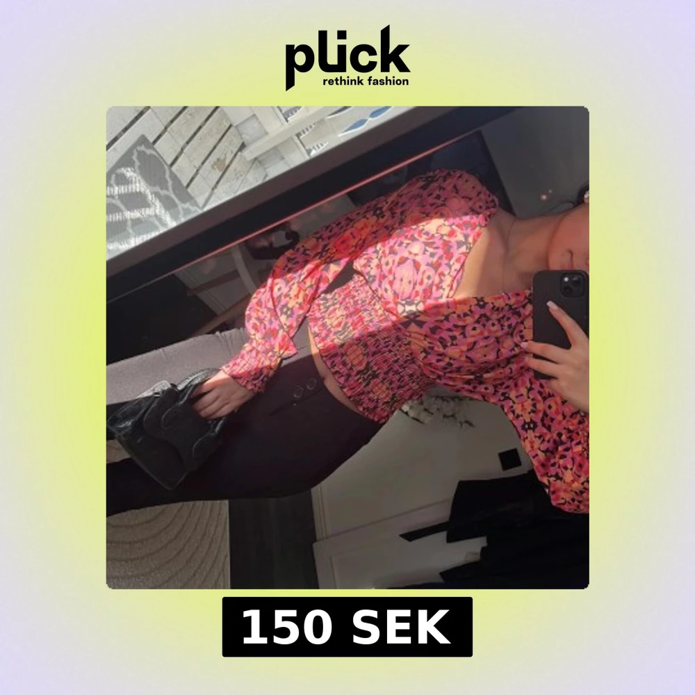 Säljer en färgglad blus med ett livligt mönster i rosa, rött och orange. Blusen har långa ärmar och en smockad midja som ger en fin passform.