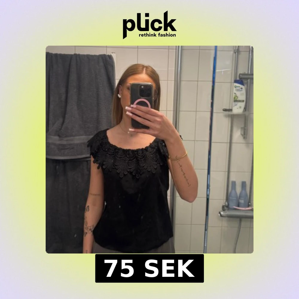 Säljer en svart offshoulder topp från Miss Cocoa med dekorativ spets längs överkanten. Toppen har en lös passform och är perfekt för dig som gillar en stilren men ändå detaljrik look.