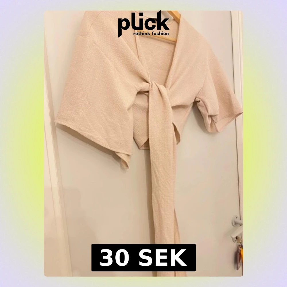 Säljer en beige bolerotopp med omlott-design och knyt framtill. Toppen har korta, vida ärmar och är tillverkad i ett strukturerat, lätt material som ger en cool och avslappnad vibe. Perfekt att styla över linne eller klänning för en trendig look.