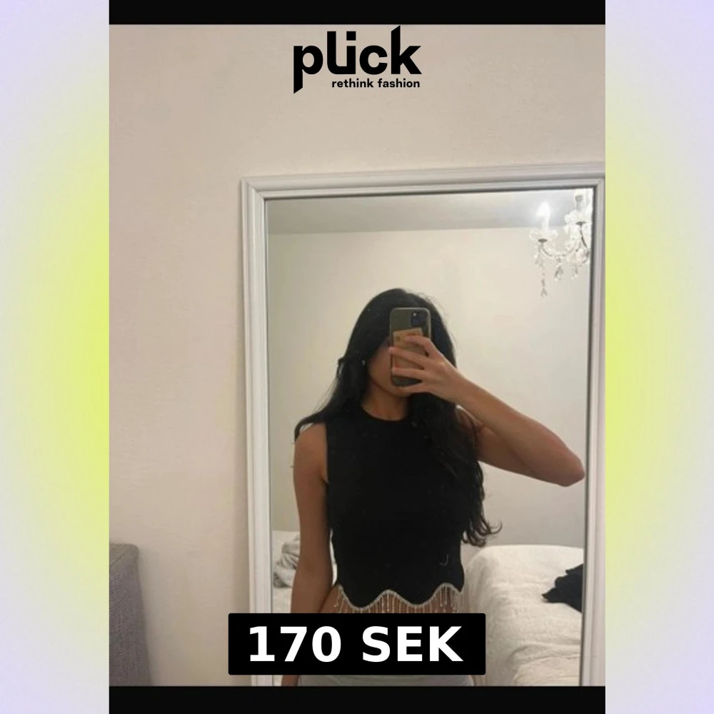 Säljer en svart croppad linnetopp med ärmlös design och rund hals. Toppen har vågig nederkant dekorerad med hängande pärlor som ger en extra glittrig vibe. Perfekt för dig som vill sticka ut med coola detaljer och snygg siluett.