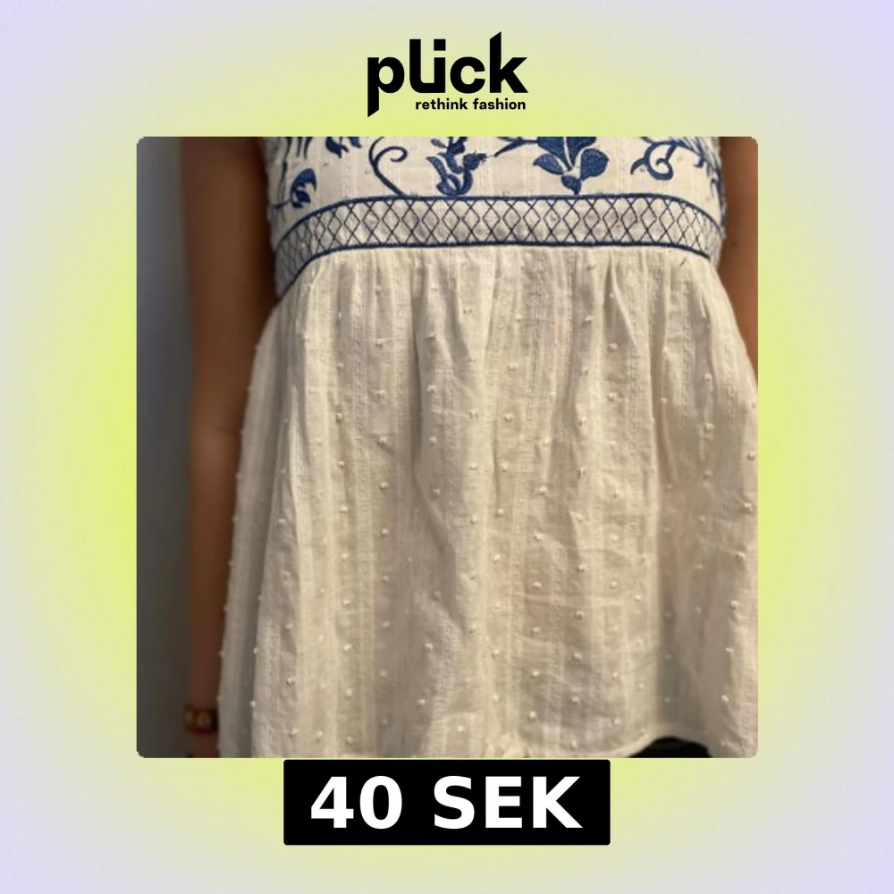 Supersöt vit blus med blå broderier upptill och volangärmar. Blusen har knytning i ryggen och små diskreta prickar i tyget. Perfekt för en somrig look!