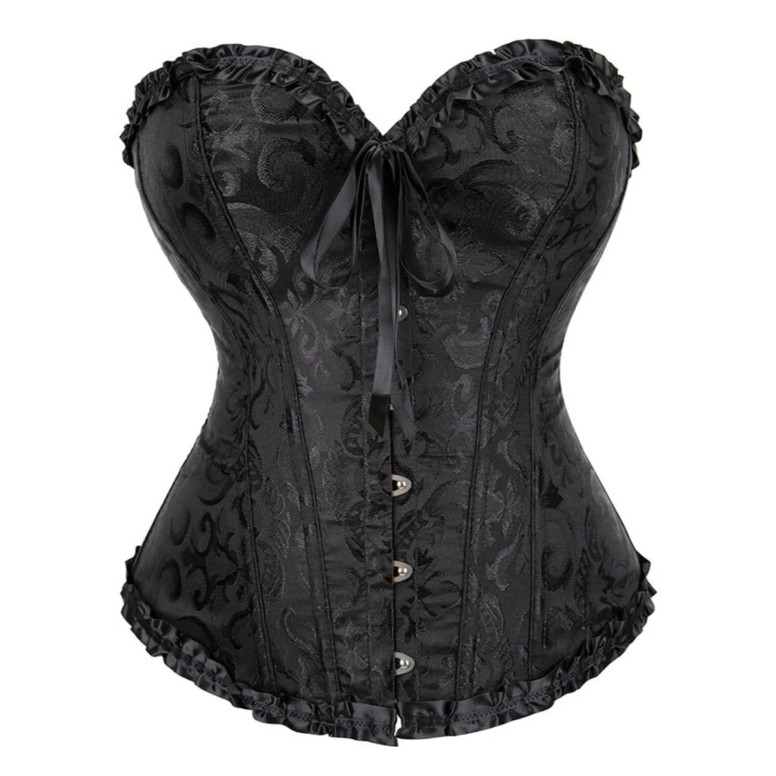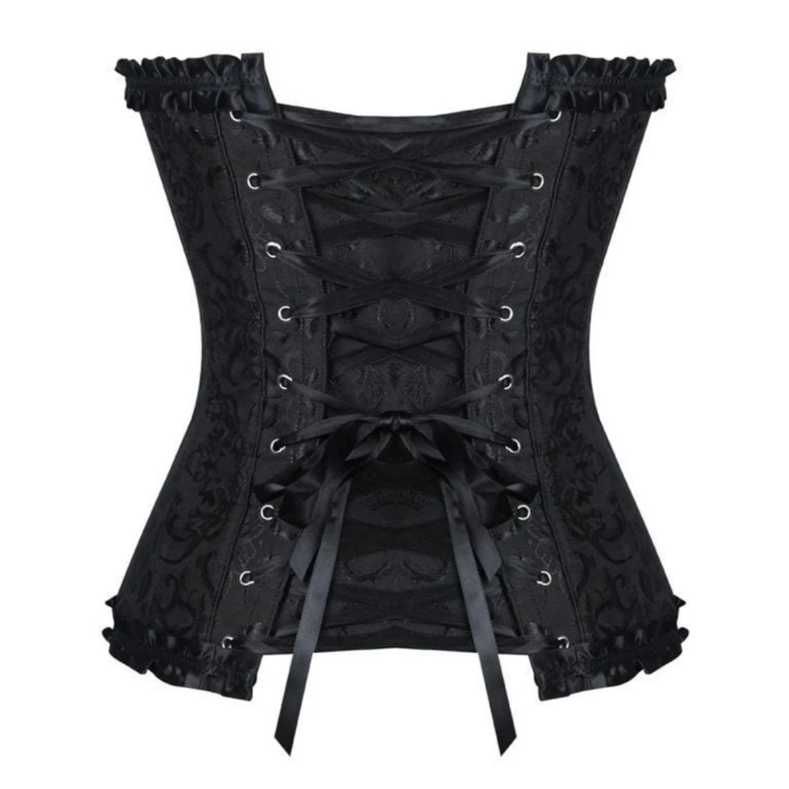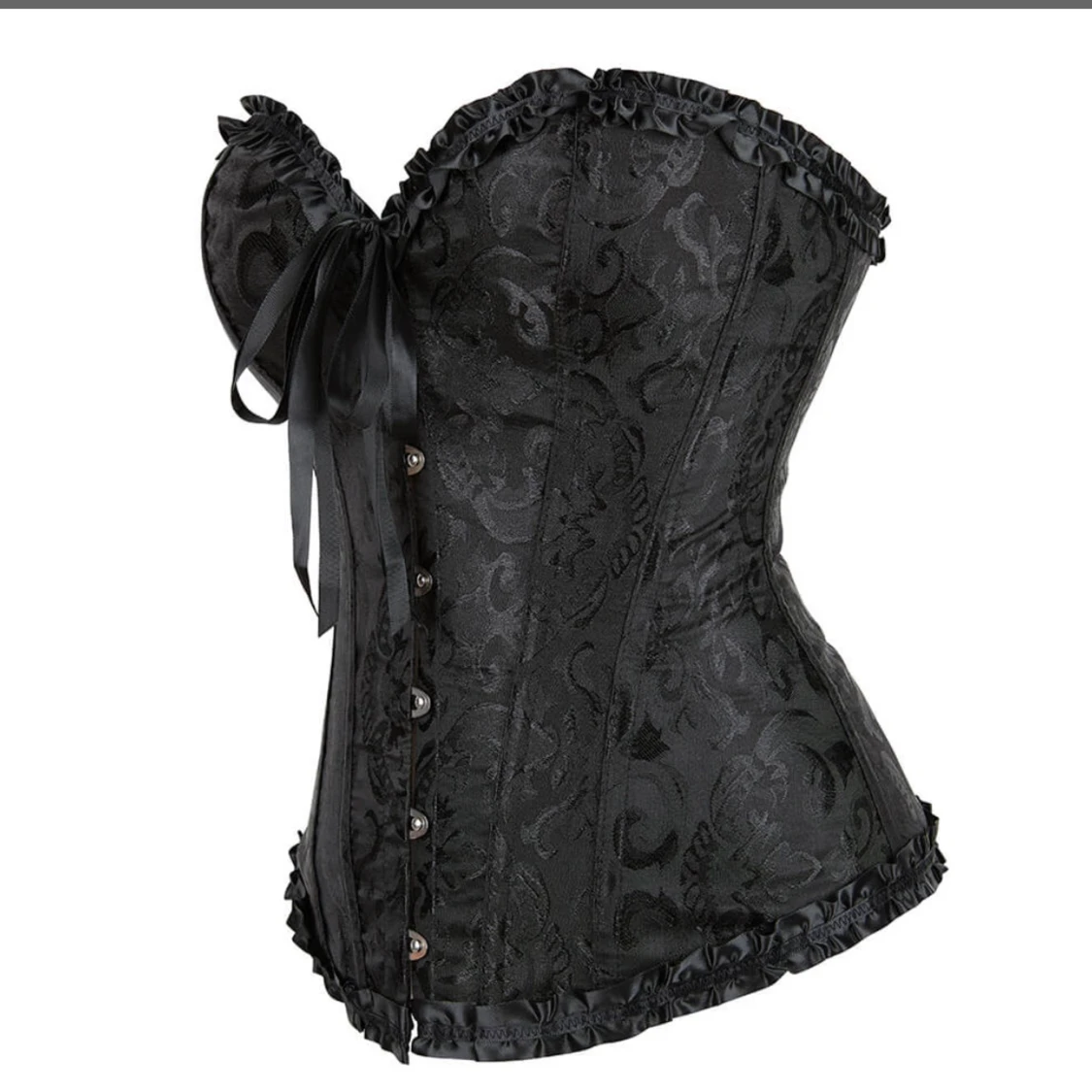 Snygg svart korsett med vackert mönstrad yta, dekorativa knappar framtill och bred snörning i satinband bak. Toppen har volangkant upptill och nedtill samt en stor rosett framtill. Perfekt nu till halloween. Oanvänd då den ej passar mig❤️