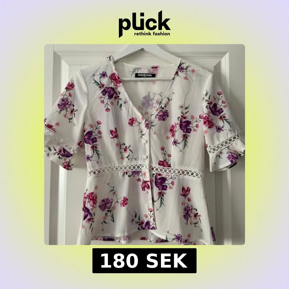 Söt vit blus med blommigt mönster i lila och rosa toner från Fashion Union. Blusen har v-ringning, knappar framtill, volangdetaljer på ärmarna och spetsdetalj vid midjan. Perfekt för vår och sommar!