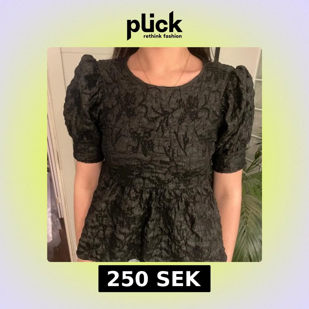 Säljer en svart blus med coolt strukturerat tyg och puffiga halvlånga ärmar. Blusen har rund halsringning och en lätt utställd passform nedtill.