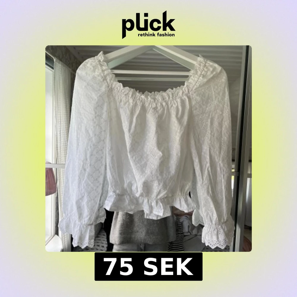 Vit blus från H&M i storlek 36. Blusen har broderade detaljer, volang vid ärmslut och nederkant samt resår vid halsringning och midja. Långärmad och lätt croppad modell.