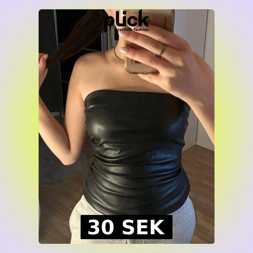 Säljer en svart axelbandslös tubtopp i skinnimitation. Toppen har en tight passform och lätt rynkade sömmar på sidorna.