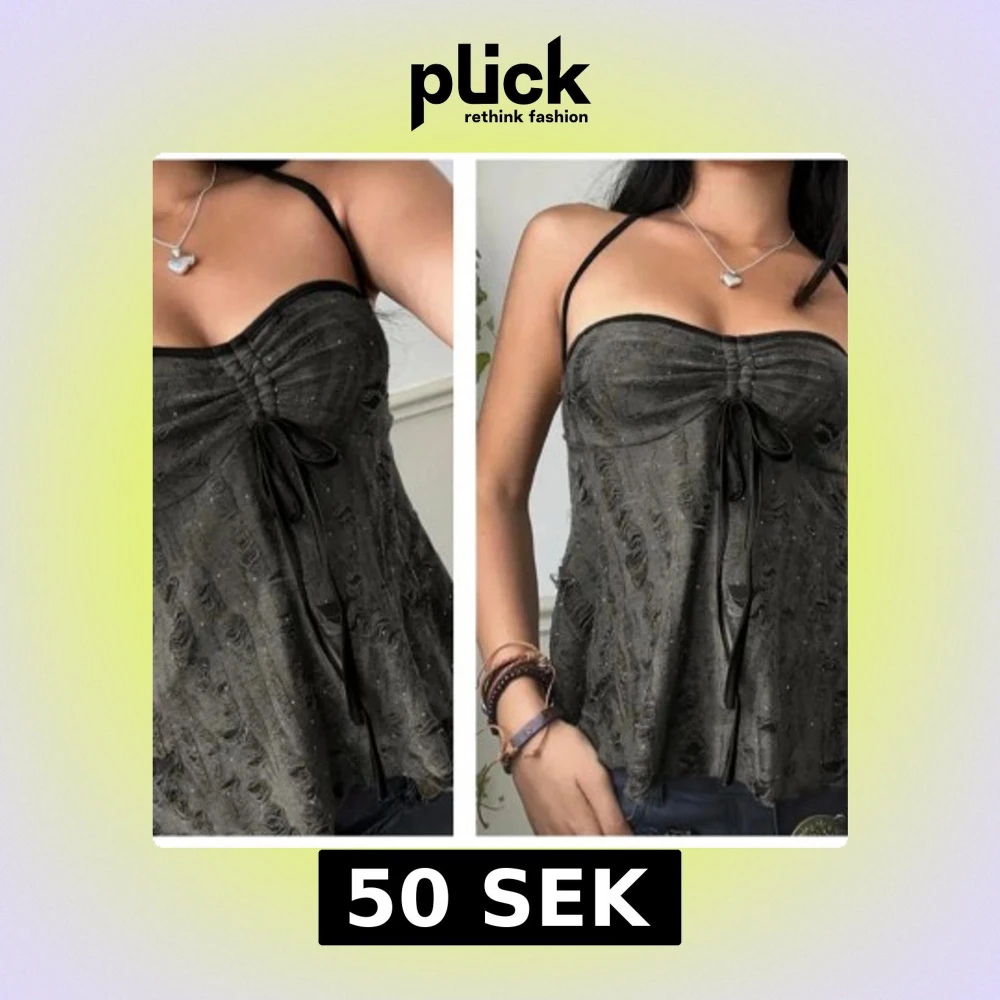 Säljer en svart glittrig linnetopp med tunna axelband och snygg snörning framtill. Toppen har en lätt rynkad byst och ett glittrande tyg med slitna detaljer som ger en cool look. Perfekt för dig som gillar trendiga och unika plagg.