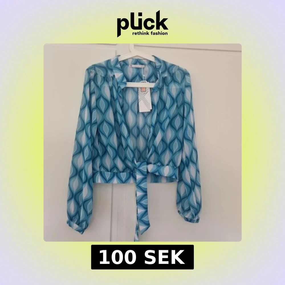 Säljer en blå och vit omlottblus med grafiskt mönster och knyt i midjan. Blusen har långa ärmar med resår vid ärmslut och är croppad i modellen. Perfekt för dig som gillar retrovibbar och färg. Tunn och luftig i materialet.